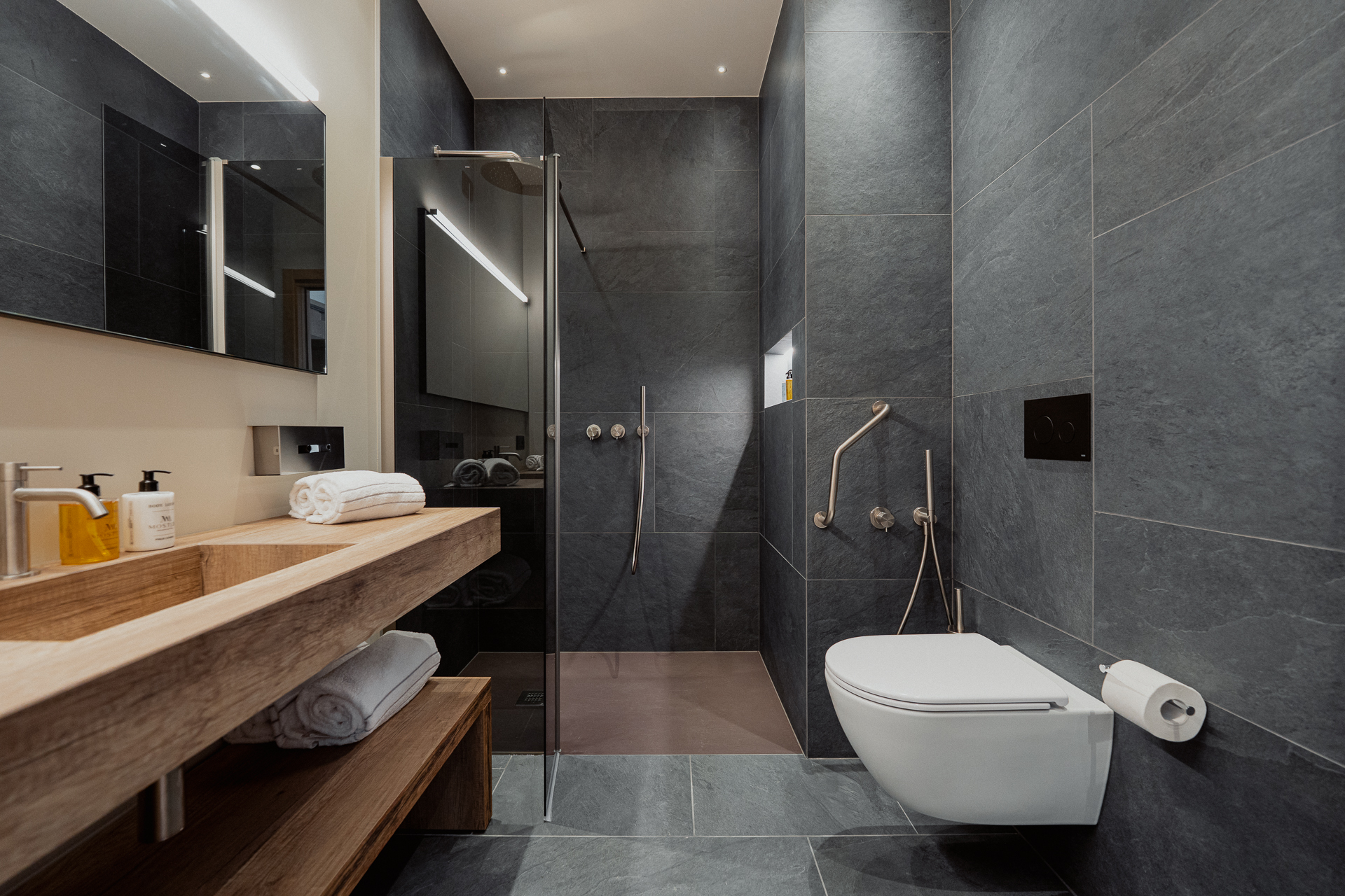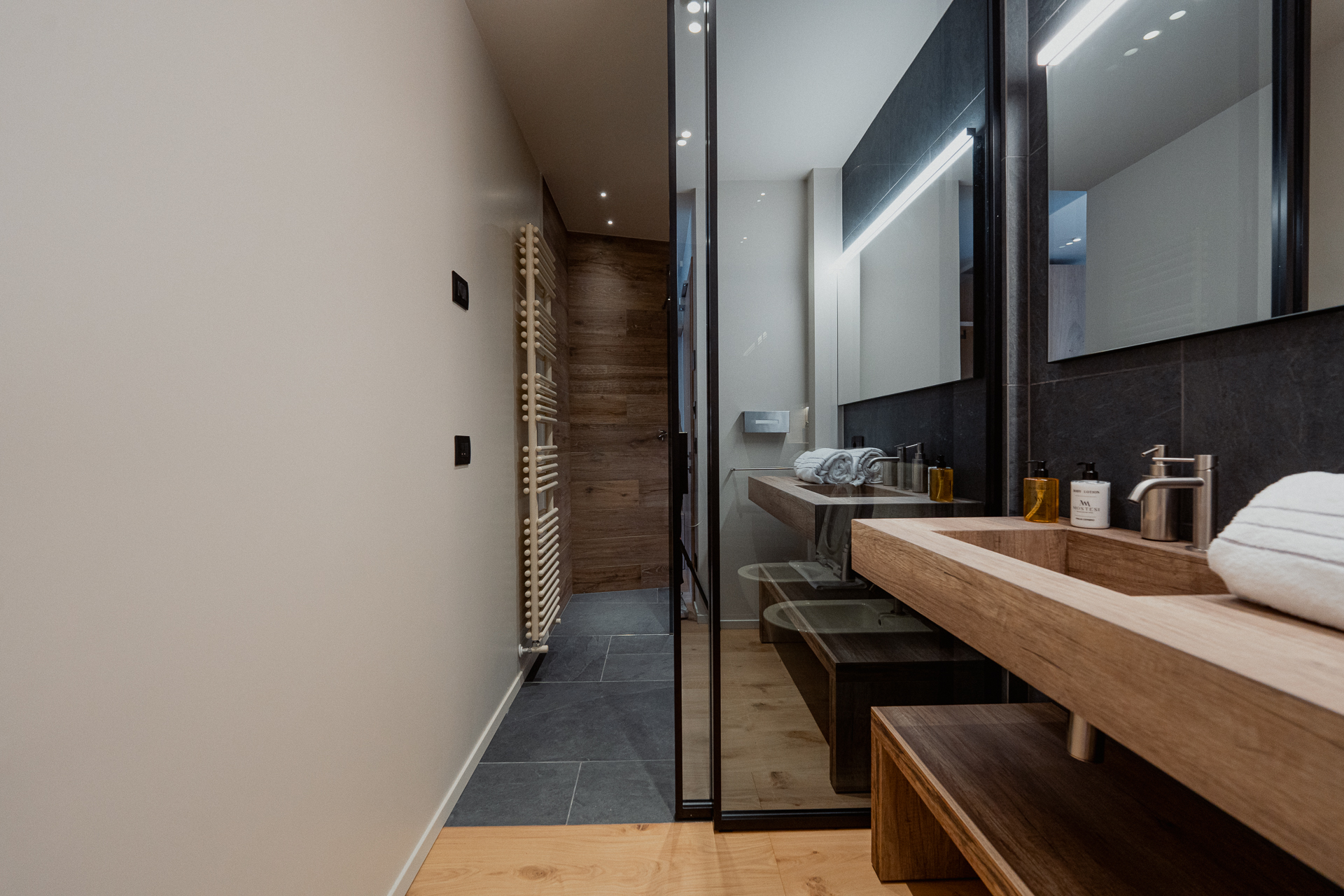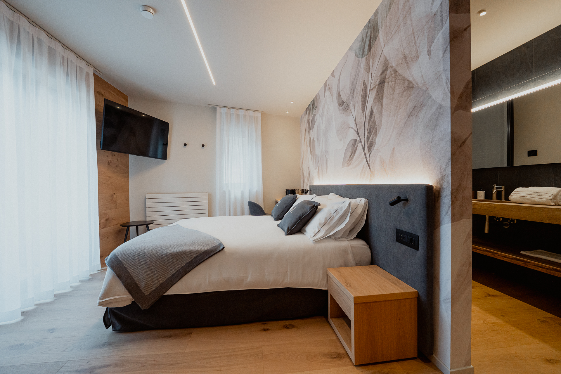 Spazio essenziale, forme pulite e materiali che parlano la lingua della natura. La Junior Suite accoglie con rovere chiaro, linee sobrie e una vasca freestanding che invita a fermarsi, respirare, ritrovare tempo per sé. Il bagno è ampio e funzionale, con una doccia walk-in che regala energia e leggerezza. Sul balcone, la montagna si fa presenza silenziosa: ideale per chi cerca un angolo intimo dove lasciar scorrere lo sguardo e i pensieri.