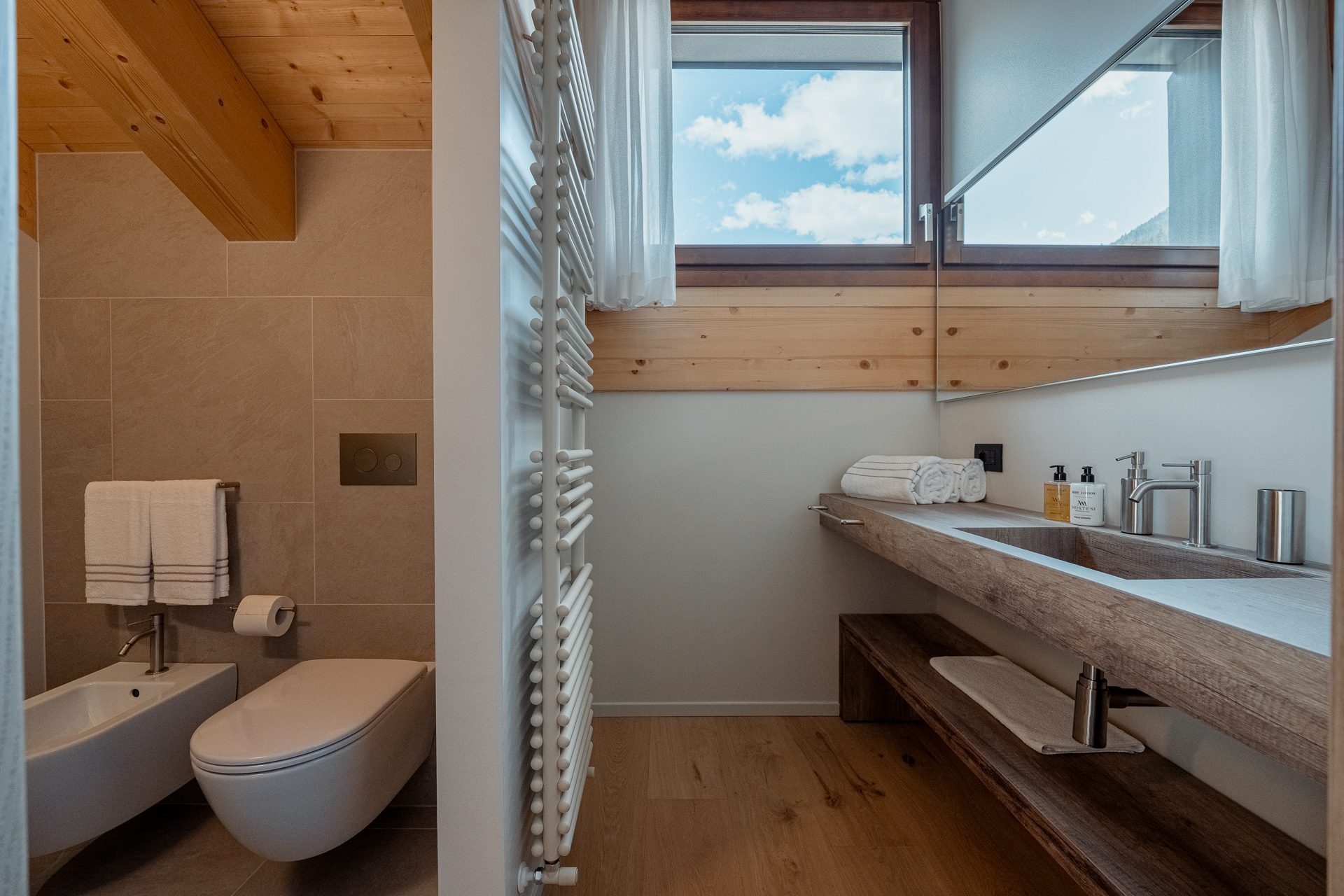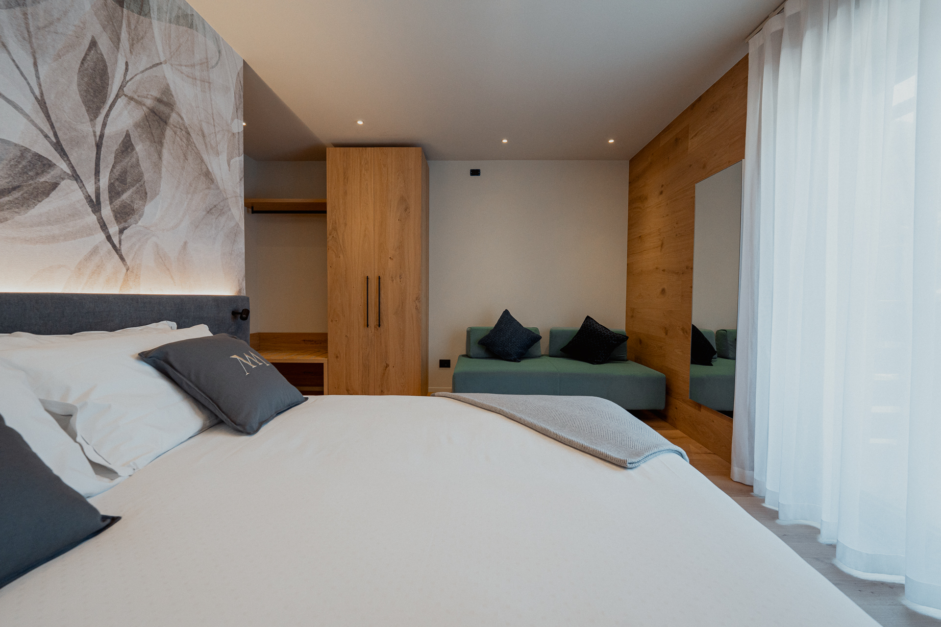 Un nido raccolto tra legno e luce, dove il design contemporaneo incontra l’anima alpina. Alcune camere sono mansardate, con travi a vista che scaldano l’atmosfera, altre si aprono su un poggiolo con vista che conquista al primo sguardo. Ogni dettaglio è pensato per il tuo benessere: letto matrimoniale ampio e comodo, bagno privato, macchina da caffè per risvegli lenti, minibar, Wi-Fi gratuito e TV a schermo piatto. Un piccolo spazio di quiete, perfetto per lasciarsi alle spalle il rumore del mondo.